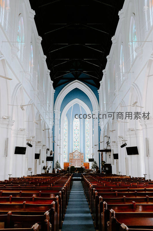 洁白的墙壁与深色屋顶形成强烈对比,整齐排列的木质长椅延伸至远方,尽头是透着光的彩色玻璃窗,整个空间宁静而庄严。