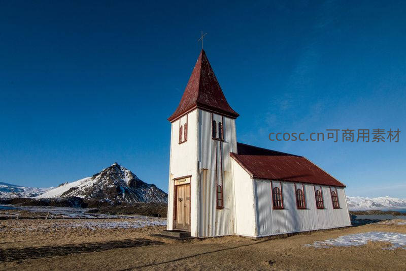 一座白墙红顶的小教堂静立于广袤的冰岛雪原之上,背景是巍峨的雪山和湛蓝的天空,画面纯净而充满诗意的孤寂感。