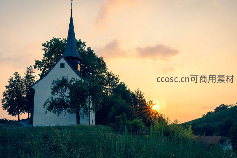 夕阳下的乡村教堂静谧安详