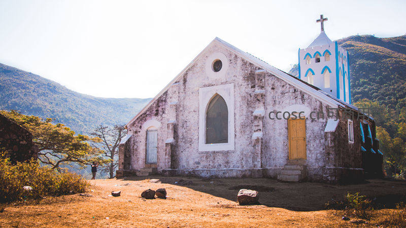 一座略显斑驳的白色教堂坐落于山丘之上,背景是连绵山脉和湛蓝天空,散发出历史沉淀的宁静之美。