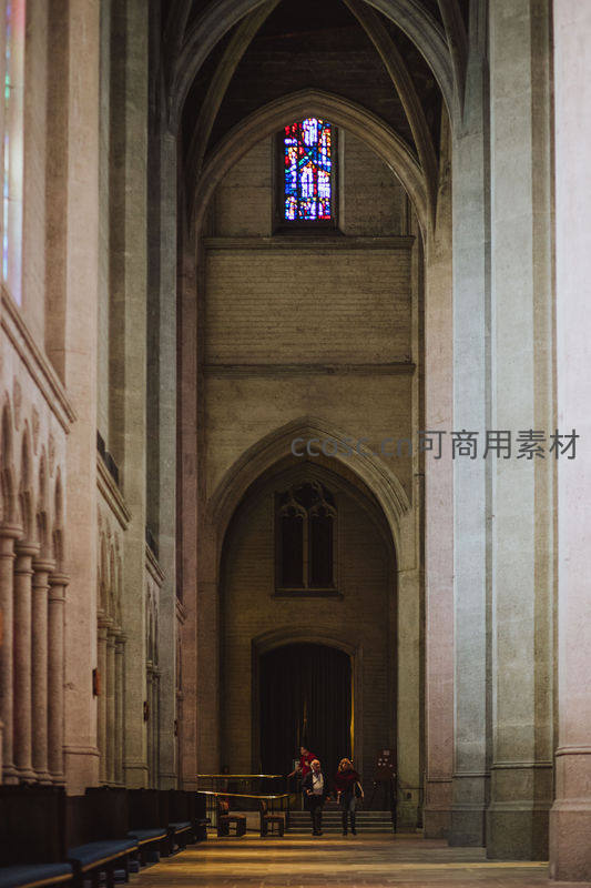 哥特式教堂高耸拱顶与彩色玻璃窗