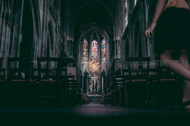 低角度拍摄的教堂内部,光线从远处彩色玻璃窗透入,在幽暗空间中投射出斑斓神圣之光,前景模糊人影增添神秘感,氛围庄重肃穆。
