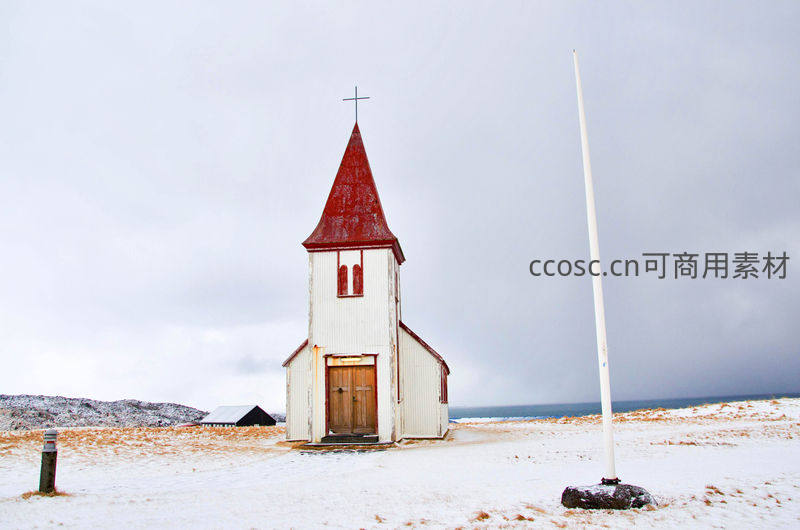 一座小巧的白色教堂带着醒目的红色尖顶,在一片白雪覆盖的荒野中显得格外宁静。阴云密布的天空下,它仿佛是冬日里的一处温暖避风港。