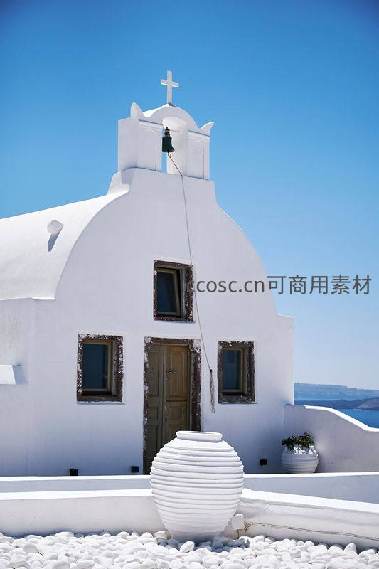 希腊圣托里尼岛标志性的白色教堂,穹顶与十字架在湛蓝天空下格外醒目,前景白色石子与陶罐点缀,尽显地中海风情。