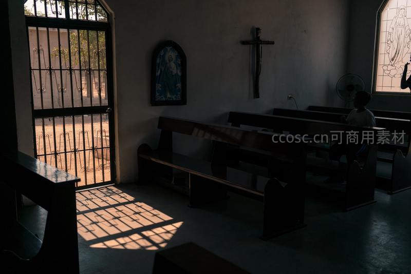 小教堂内静谧光影与信徒