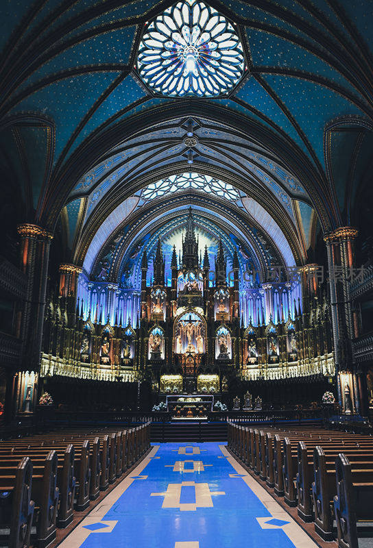 教堂内部以深邃蓝色为主调,巨大的玫瑰窗洒下圣光,金碧辉煌的祭坛在灯光映衬下熠熠生辉,充满神圣与艺术感。