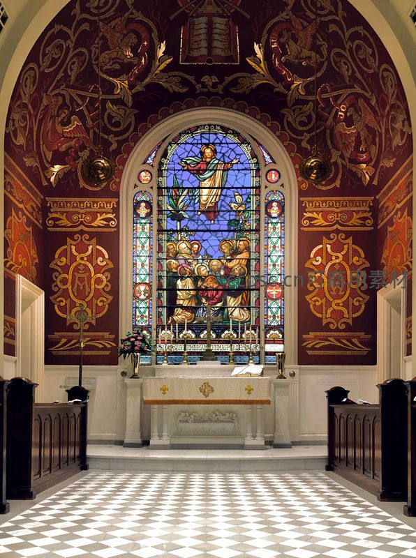 祭坛上方是描绘耶稣升天的精美彩色玻璃窗,周围环绕着金红相间的繁复壁画,棋盘格地板反射着柔和光线,尽显神圣与华美。