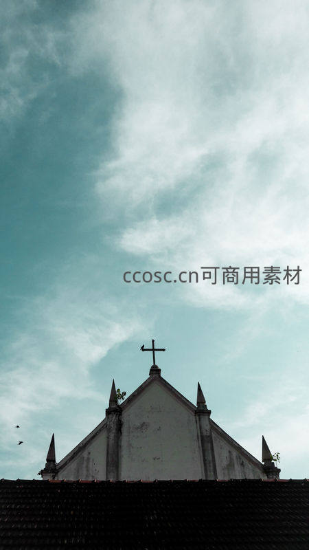 教堂屋顶在蓝绿色云层映衬下呈现深色剪影,中央十字架清晰突出,几只飞鸟掠过天际,营造出静谧而庄严的历史氛围。