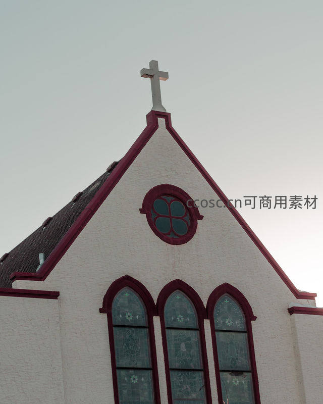 一座白色外墙配以红色边框的教堂,尖顶上矗立着十字架,圆形与拱形彩色玻璃窗在柔和光线下透出神圣气息。