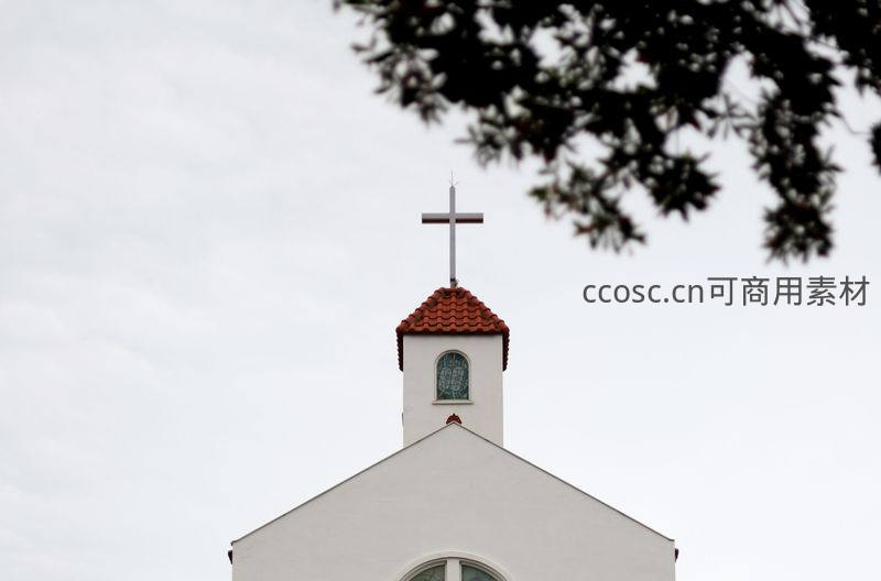 白色教堂钟楼顶部覆盖红瓦,顶端竖立十字架,前景树叶虚化形成自然画框,营造静谧而神圣的氛围。