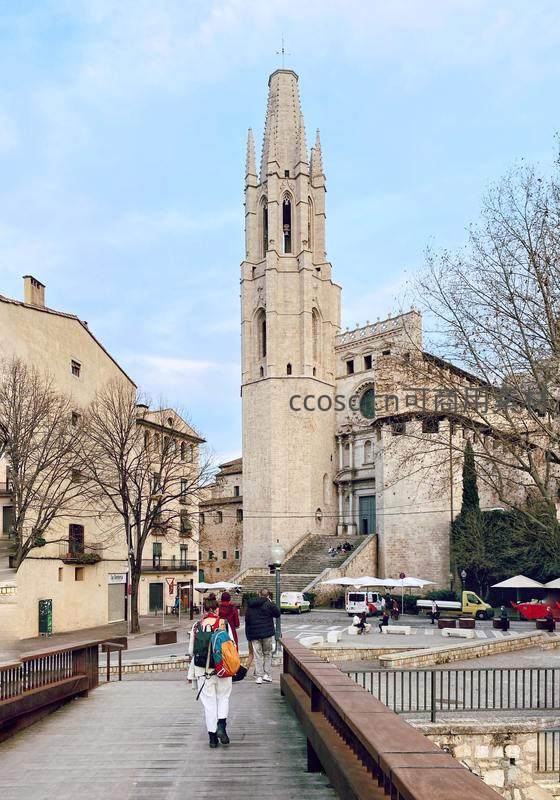 一座宏伟的哥特式教堂钟楼耸立在城市广场中央,游客背着行囊缓步走过石桥,周围是典型的欧式建筑和光秃的冬日树木,天空湛蓝。