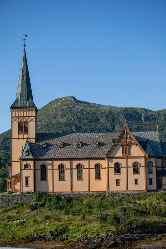 一座典雅的木制教堂矗立在青山绿水间,尖塔直指蓝天,与自然和谐共生,展现北欧建筑的独特魅力与宁静之美。