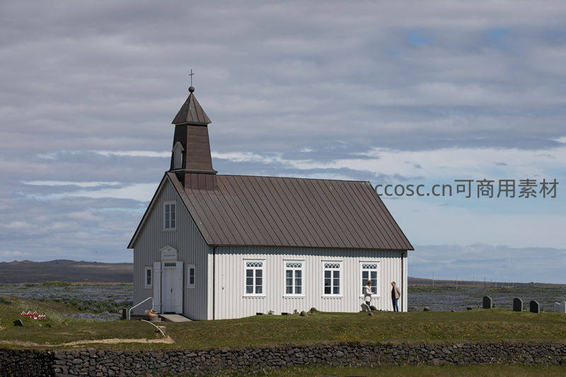 一座纯白的北欧风格教堂矗立在开阔的海岸草地上,远处是辽阔海景,两人伫立门前,画面宁静而富有诗意。