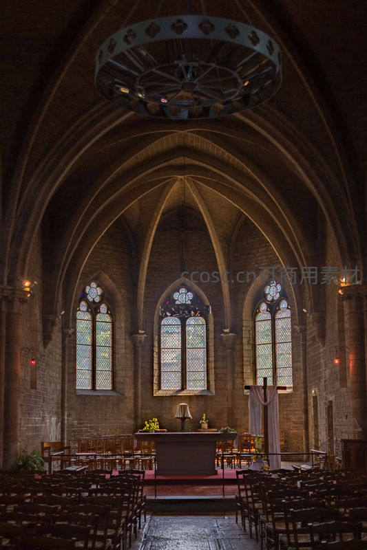 高耸的哥特式拱顶下,阳光透过彩色玻璃窗洒落,照亮了庄严的祭坛和整齐排列的木质长椅,营造出静谧神圣的氛围。