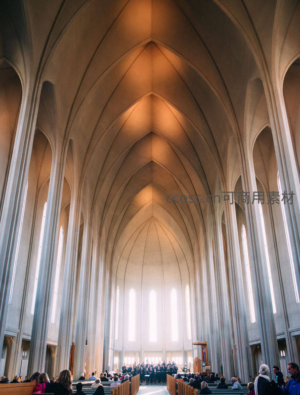 现代教堂内部高耸穹顶下的礼拜场景
