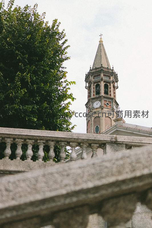 透过前景斑驳的石质栏杆,一座装饰精美的古典钟楼矗立于蓝天之下,塔身时钟清晰可见,旁有茂密绿树相映成趣。