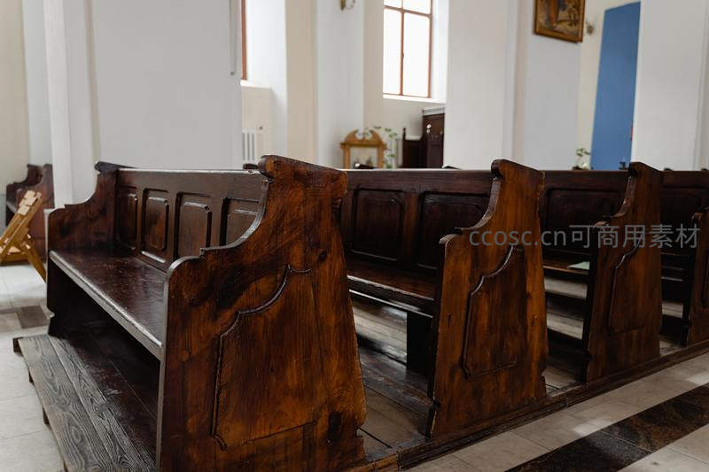 一排排深褐色手工雕刻的木制长椅整齐排列在教堂内,阳光透过高窗洒落,营造出沉静、肃穆的信仰空间。