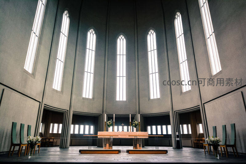 现代教堂内部,高窗洒落神圣之光
