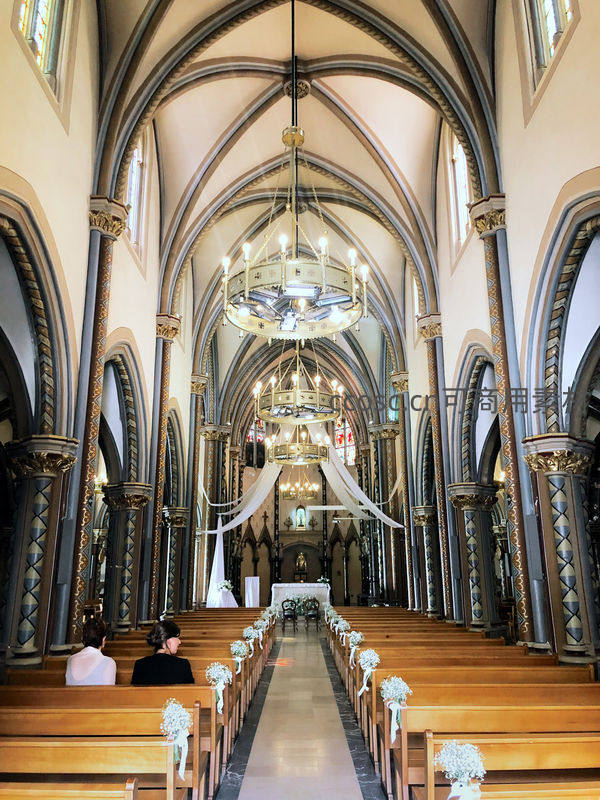 教堂内部婚礼布置,拱顶高耸,长椅两侧鲜花点缀