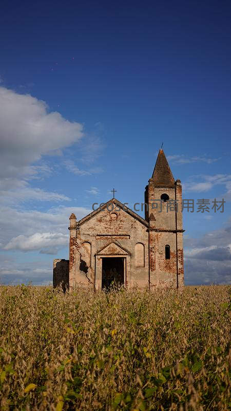 田野中的废弃教堂,蓝天白云下显沧桑之美
