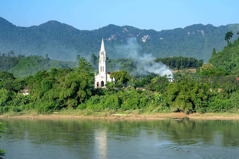 一座白色尖顶教堂静立于河岸绿林之中,远山如黛,薄雾缭绕,河水倒映着建筑轮廓,构成一幅宁静祥和的田园画卷。