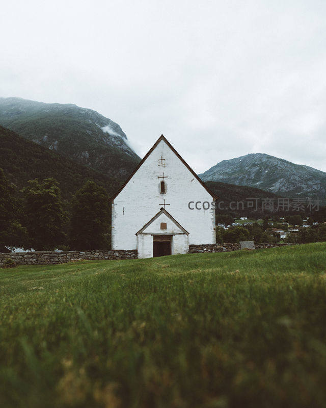 雪山脚下白色教堂静谧伫立