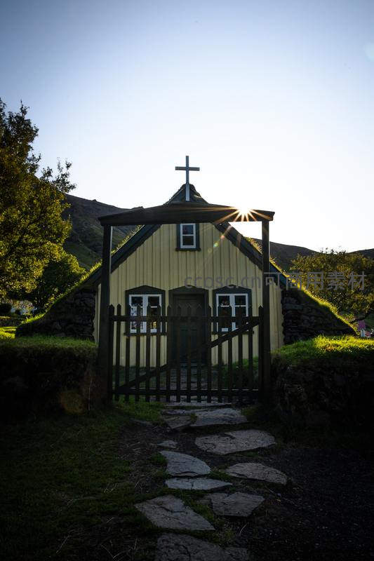 冰岛草顶小教堂沐浴夕阳余晖