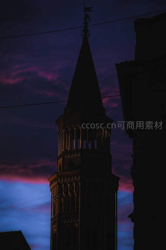 暮色钟楼剪影映紫霞天空