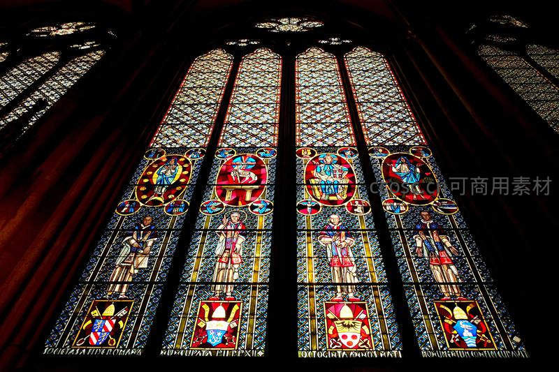 高大的彩色玻璃窗以绚丽色彩和精细图案描绘宗教人物与故事,阳光穿透时在幽暗室内投射出神圣光芒,是信仰与艺术的完美结合。