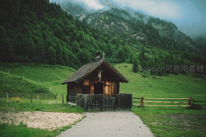 山间小木屋静谧如画的田园风光