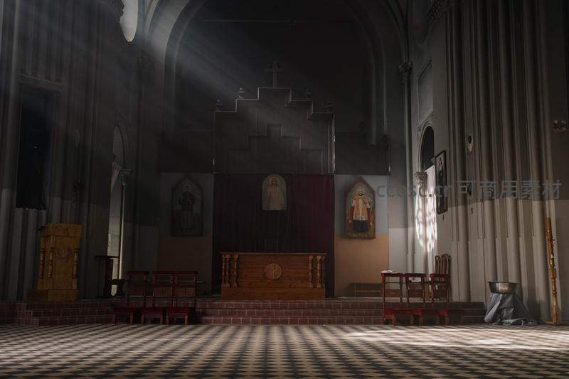 阳光穿透高窗,在黑白棋盘格地面上投下斑驳光束,空旷的长椅与庄严祭坛共同营造出令人屏息的神圣静谧空间。