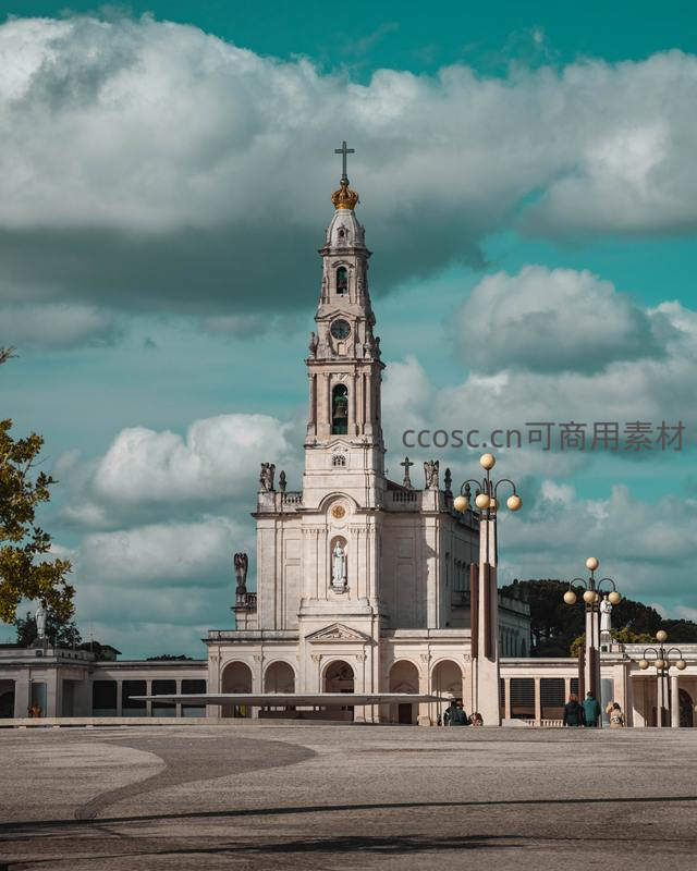 高耸的白色圣殿在蔚蓝天空与翻滚白云下显得格外宏伟,开阔广场上零星游客驻足,尽显信仰之地的庄严与开阔。