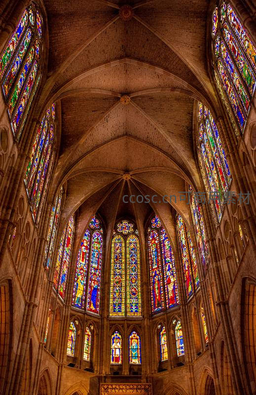 教堂内部彩色玻璃窗的神圣光影