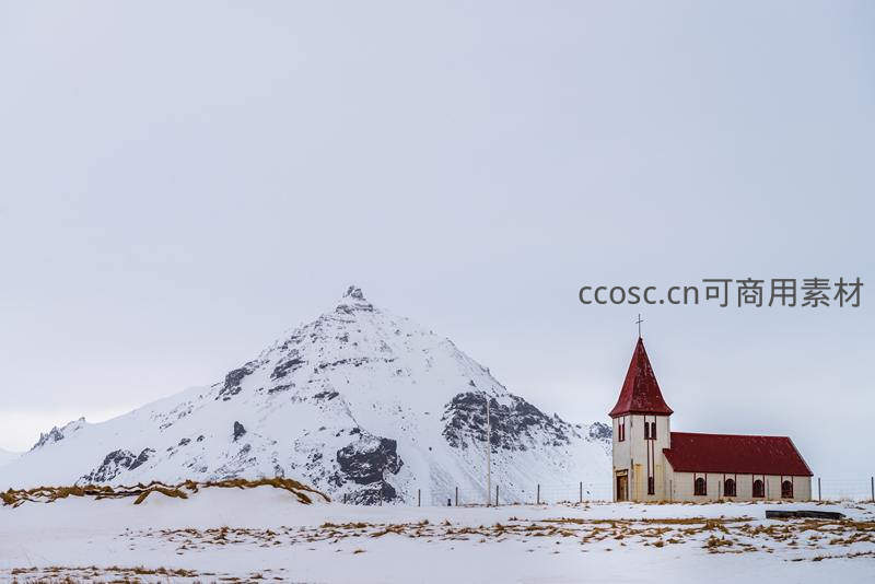 在广袤的冰雪世界中,一座小巧的红顶教堂静静矗立,背后是巍峨的雪山,天地一色,营造出一种超脱尘世的纯净与孤寂之美。