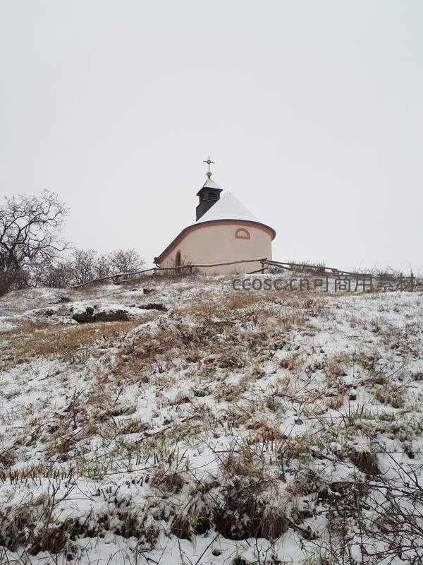 一座小巧的白色教堂坐落在覆盖着薄雪的山坡上,周围是枯黄的草地和光秃的树枝,天空灰白,营造出一种宁静而略带萧瑟的冬日氛围。