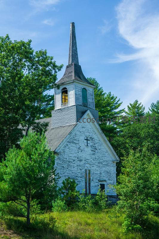 在阳光明媚的夏日,一座白色的木结构教堂被茂密的绿色树林环绕,高耸的尖顶直指蓝天白云,显得格外清新、宁静与神圣。