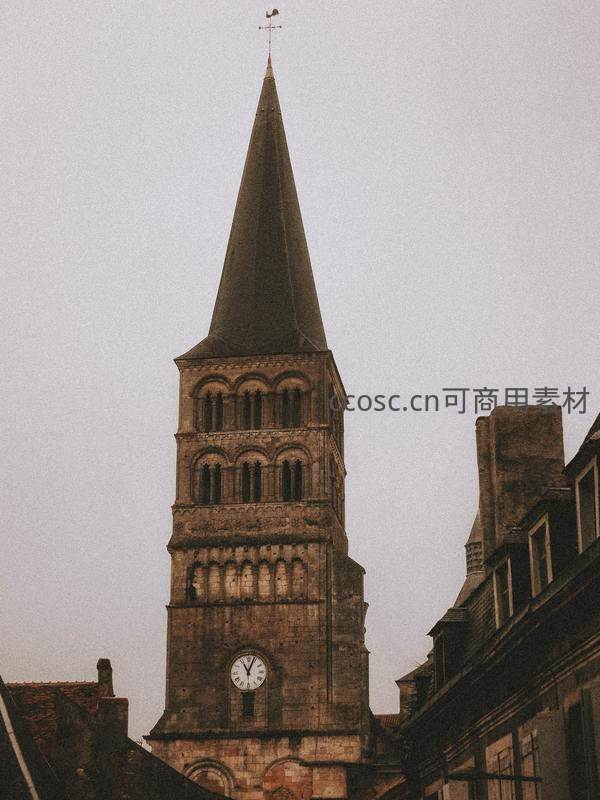 阴天下的古老钟楼高耸入云