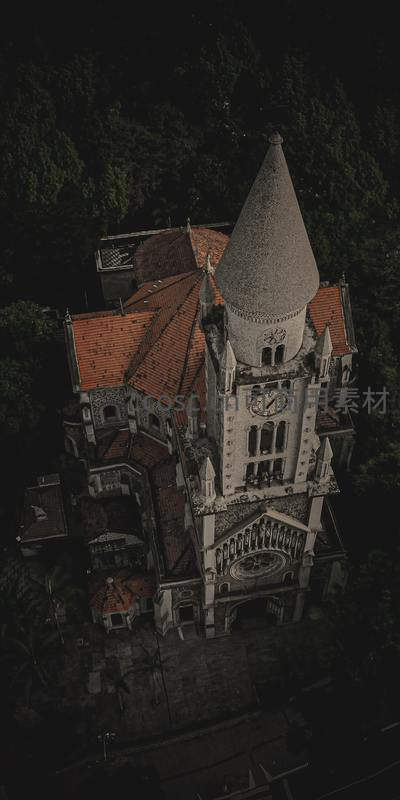 从高空俯瞰,一座哥特式风格的教堂隐匿于茂密森林之中,红瓦屋顶与灰色尖塔形成鲜明对比,钟楼上的时钟清晰可见,尽显历史厚重感。