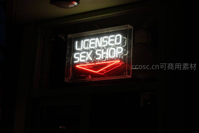 夜晚街角店铺外悬挂透明亚克力框内白字红箭头霓虹招牌,醒目标示“LICENSED SEX SHOP”,充满都市夜生活气息。