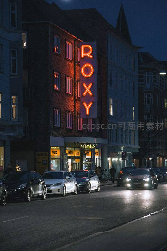 夜晚街道旁橙色霓虹“ROXY”招牌照亮街景