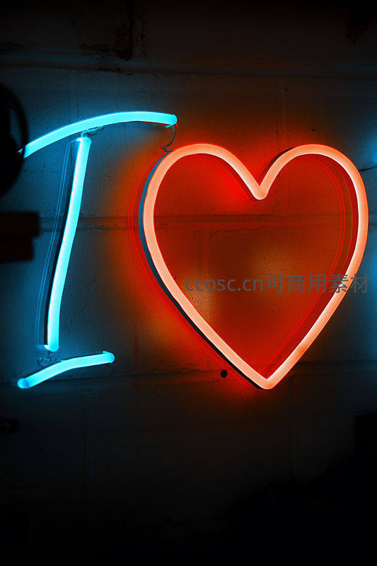 由蓝色“I”和红色心形组成的霓虹灯组合,表达爱意与浪漫,适合情人节、婚礼或情侣打卡场景,视觉冲击力强。