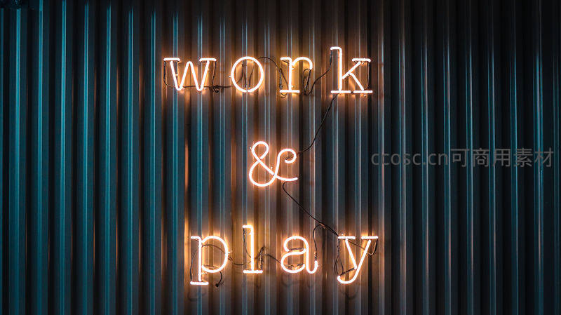 温暖的黄色霓虹灯在深蓝色竖条纹金属墙面上拼出“work & play”,简洁有力地传达了现代人追求工作与生活平衡的理念,充满设计感和启发性。