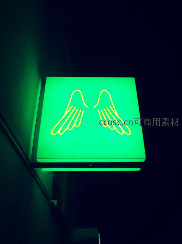一个发出明亮绿光的方形招牌上,用黄色霓虹灯勾勒出一对简洁的翅膀图案,悬挂在昏暗的角落,充满现代艺术感和象征意义。