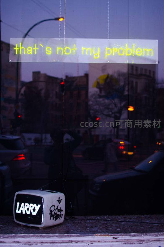 透过玻璃窗,黄昏的城市街道映入眼帘,上方悬挂着黄色霓虹标语“that's not my problem”,下方一台印有“LARRY”的复古电视机静静摆放,充满后现代都市的疏离感。
