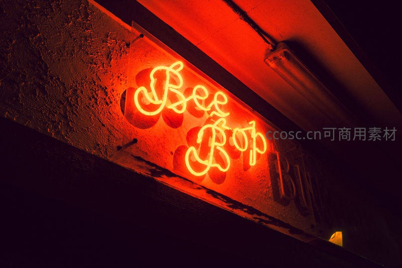 昏暗墙面上,一个暖橙色的“Bee Bop”霓虹灯招牌散发着怀旧光芒,为夜晚街角增添了一抹迷人的爵士风情。