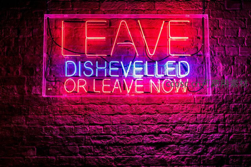 深色砖墙上悬挂着红蓝双色霓虹灯牌,写着“LEAVE DISHEVELLED OR LEAVE NOW”,充满个性与挑衅的艺术表达。
