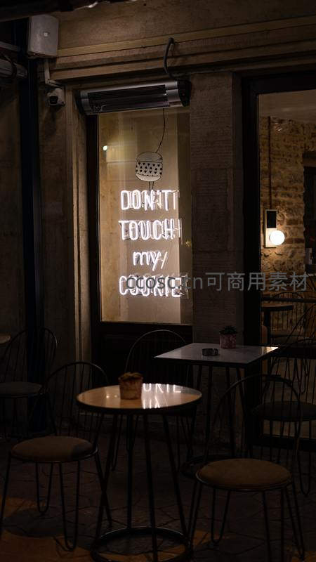 夜晚街边咖啡馆的霓虹招牌在昏暗中闪烁,搭配简约桌椅与暖光,营造出温馨又时尚的都市休闲氛围。