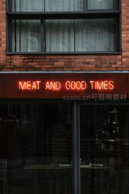 橙色霓虹字“MEAT AND GOOD TIMES”悬挂在红砖外墙,透过玻璃门可窥见内部装潢,传递轻松愉悦的用餐理念。