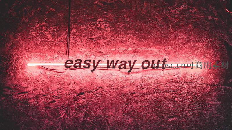 一道横向红色霓虹灯管镶嵌在斑驳的水泥墙上,中间印有“easy way out”字样,呈现粗犷工业风与现代艺术结合的视觉效果。