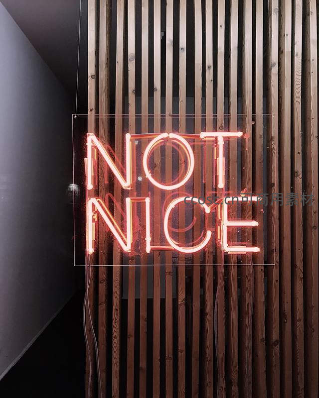 橙色霓虹灯“NOT NICE”悬挂在木质格栅墙前